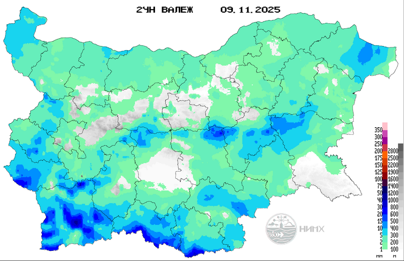 Площно разпределение на 24-часово (от 7:30 ч. на 08.11.2025 г. до 7:30 ч. на 09.11.2025 г.) количество валеж (mm, l/m2) според данни от класически валежомерни станции на НИМХ и данни от оперативен атмосферен числен модел за прогноза на времето (ALADIN) на НИМХ. Картите са достъпни към 12 ч. Произвеждат се автоматично и понякога е възможно да съдържат неточни данни, които се коригират по-късно.