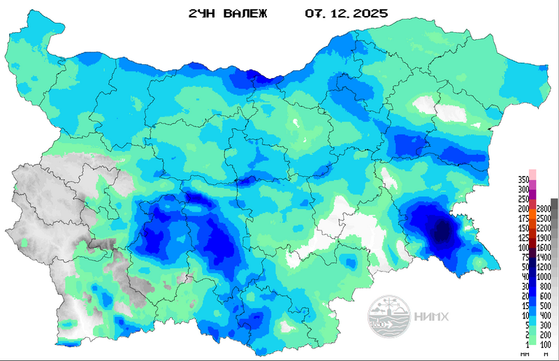 Площно разпределение на 24-часово (от 7:30 ч. на 06.12.2025 г. до 7:30 ч. на 07.12.2025 г.) количество валеж (mm, l/m2) според данни от класически валежомерни станции на НИМХ и данни от оперативен атмосферен числен модел за прогноза на времето (ALADIN) на НИМХ. Картите са достъпни към 12 ч. Произвеждат се автоматично и понякога е възможно да съдържат неточни данни, които се коригират по-късно.